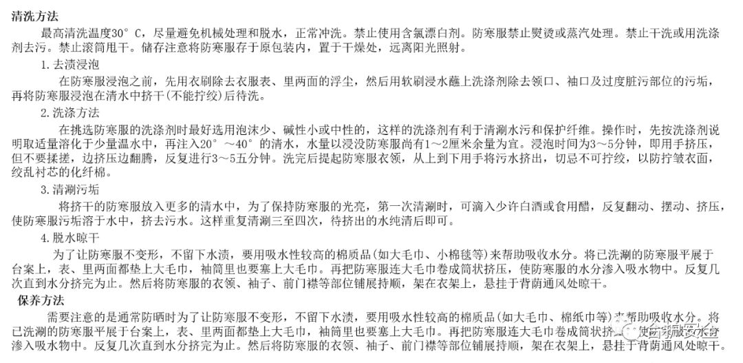 防寒服的清洗和保養(yǎng):